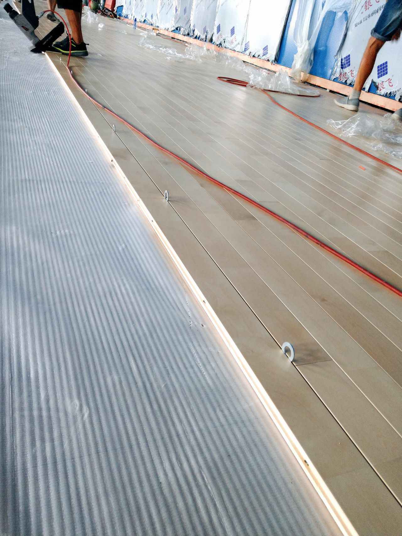 Lap-laying method is adopted for the moisture-proof plastic sheet on the bottom layer. The fixed and firm spacing of rubber pads is 450mm. The site is designed as a double-layer sleeper structure with suspended paving. The lower sleeper is laid out along the long direction of the venue with a distance of 450mm. The upper sleeper is laid along the short direction of the venue, and the two sides are laid out parallel to the short side with a distance of 400mm; Reserve a 10--20mm wide expansion gap, and use rubber pads to cushion the sleeper joints.